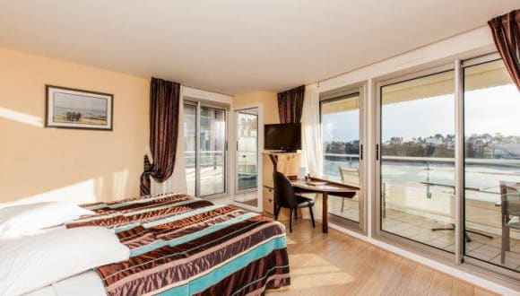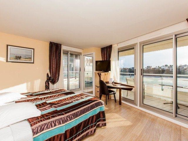Unsere nicht Raucher Zimmer sind mit Doppelbett -1.40m bis 1.60m- oder Zweibett -2x1.00m-, Badezimmer oder Duschraum und WC, Schreibtisch, Minibar, Fernsehen mit Flachbildschirm, und Verbindung Wifi ausgestattet. Die Zimmer mit See Blick profitieren außerdem von einem Balkon, der ausgestattet und nach St Malo ausgerichtet ist. Einige Zimmer können von einem kleinen Korridor miteinander verbunden sein und besonders Familie aufnehmen. Unsere Suite sind Wohnungen, die 2 Zimmer, Badezimmer + Duschraum, WC, Wohnzimmer, kleine Küche, und auch 1 Terrasse mit wunderbach See Blick einschließen.