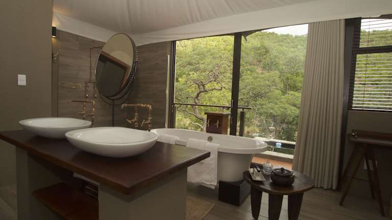 Die Inzalo Safari Lodge bietet Zeltsuiten als einzigartige Unterkunftsoption an. Jede Suite verfügt über eine private Aussichtsterrasse, auf der Sie den Blick auf die umliegende Natur genießen können. Das Highlight jeder Suite ist das Tauchbecken, in dem Sie sich an heißen Tagen erfrischen können. Im luxuriösen Badezimmer finden Sie eine Badewanne sowie eine Innen- und Außendusche. Die Zimmer sind auch mit einem gemütlichen Sitzbereich ausgestattet, in dem Sie sich entspannen und die Atmosphäre der Lodge genießen können.