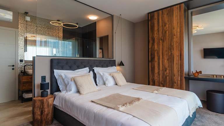Das Apartment umfasst zwei Schlafzimmer, ein Wohnzimmer und eine voll ausgestattete Küche mit Kühlschrank und Kaffeemaschine. Es gibt zwei Badezimmer mit Dusche und Whirlpool. Handtücher und Bettwäsche sind vorhanden, und die Unterkunft ist klimatisiert.