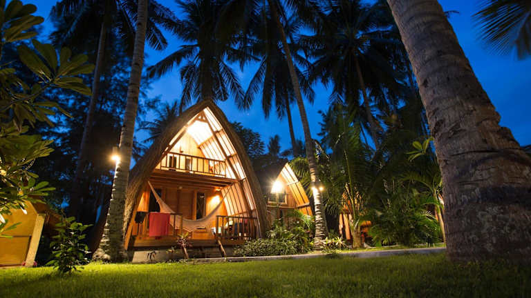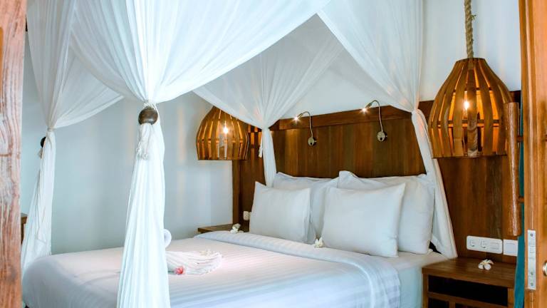 Die im Bungalow-Stil eingerichteten Zimmer im Island View sind gemütlich und komfortabel. Sie verfügen entweder über einen Ventilator oder Klimaanlage, um Ihnen eine angenehme Temperatur zu bieten. Jedes Zimmer hat eine eigene Terrasse mit Blick auf den Garten, wo Sie die Ruhe und Schönheit der Umgebung genießen können. Das Badezimmer ist mit einer Dusche im Freien ausgestattet, die ein einzigartiges Duscherlebnis bietet.