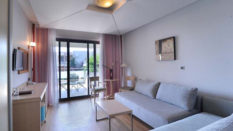 Die komfortablen, geräumigen Zimmer und Suiten mit modernem Dekor bieten Ruhe und Entspannung mit Blick auf die schöne Gartenanlage oder das Meer. Zur Verfügung stehen Standardzimmer (25m², mit Gartenblick, bis 3 Personen), Superior Zimmer (25m², Meerblick, bis 3 Personen), Junior Suiten (40m², Garten- oder Meerblick, bis 4 Personen) und Familienzimmer (45m², Garten- oder Meerblick, bis 4 Personen).