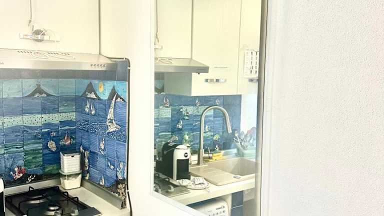Die Küche des Ferienhauses ist mit einem Kühlschrank, einer Herdplatte und einer Kaffeemaschine ausgestattet.