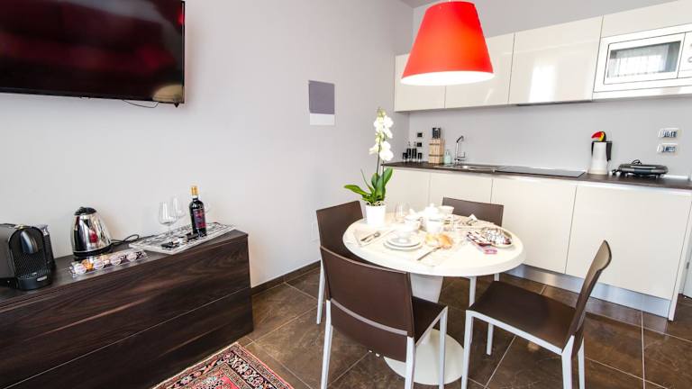 Alle Apartments sind mit einer komplett ausgestatteten Küche ausgestattet, die Küchenutensilien, einen Kühlschrank, ein Induktionskochfeld, eine Mikrowelle, einen Geschirrspüler und eine Kaffeemaschine umfasst. Im Wohnzimmer befindet sich ein Doppelschlafsofa, ein Esstisch für 4 Personen und ein TV. Jedes Apartment verfügt über ein Schlafzimmer mit Doppelbett und ein Badezimmer mit Dusche. Handtücher und Bettwäsche sind in allen Unterkünften vorhanden. Die Apartments sind klimatisiert und bieten Internetzugang, einen Haartrockner und ein Bügeleisen/-brett.