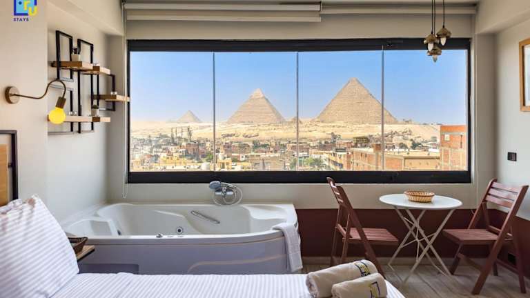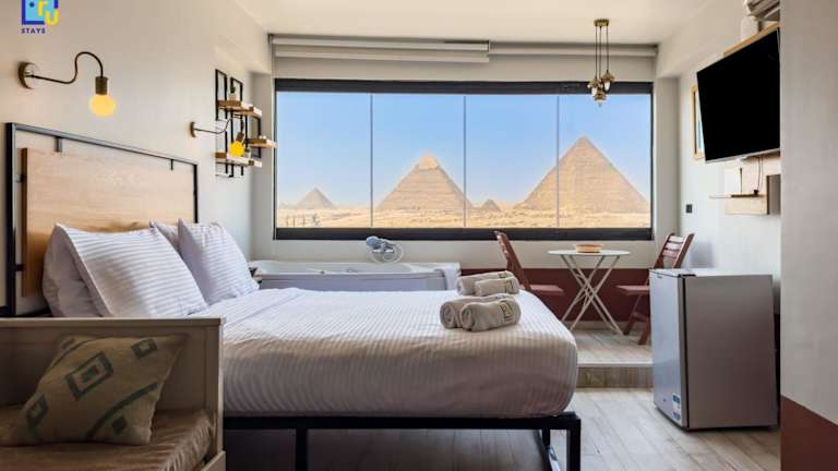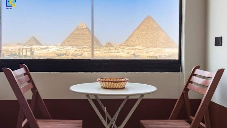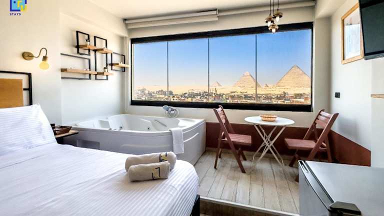 Die Unterkunft liegt 1,9 km von der Großen Sphinx von Gizeh entfernt und bietet einen Blick auf die Stadt. Die Pyramiden von Gizeh sind 4 km entfernt, während der Fernsehturm von Kairo 13 km entfernt ist. Der nächstgelegene Flughafen ist der Flughafen Kairo, der sich 29 km von der Unterkunft befindet.