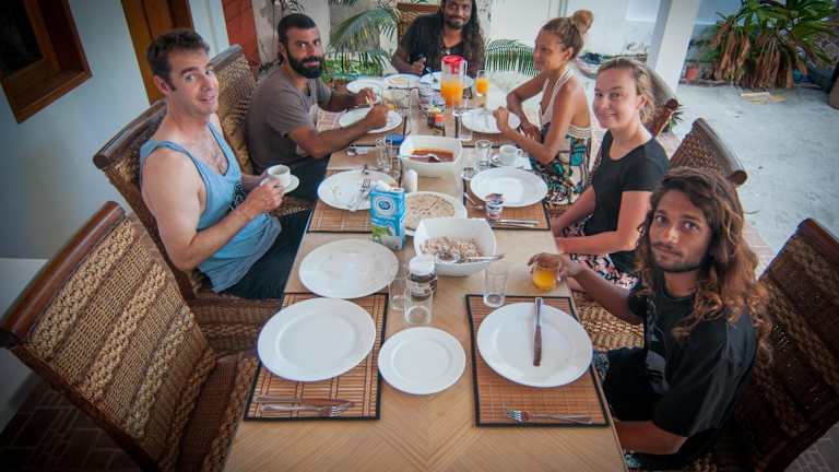 Das Jail Break Surf Inn verfügt über eine voll ausgestattete Gemeinschaftsküche, in der die Gäste ihre eigenen Mahlzeiten zubereiten können. Alternativ können sie auch in einem nahegelegenen Restaurant speisen, zu dem ein Bootstransfer angeboten wird.