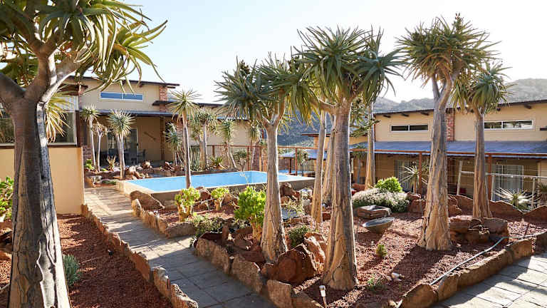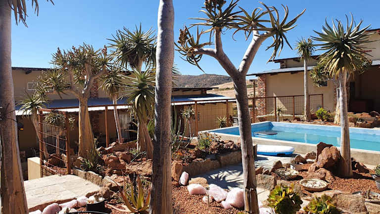 Die Pension Jakkalswater Guest Farm befindet sich in einer malerischen Lage, umgeben von den beeindruckenden Pisten und Granitfelsen des Kamiesbergs. Die Unterkunft liegt etwa 16 km von Springbok entfernt und bietet eine abgelegene Atmosphäre, die Ruhe und Erholung garantiert. Die Lage abseits des Stromnetzes ermöglicht es den Gästen, eine nachhaltige Unterkunft zu erleben, die Solarenergie, einen Wasserbrunnen und Gasgeräte nutzt.