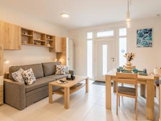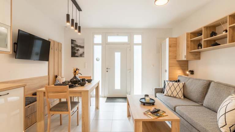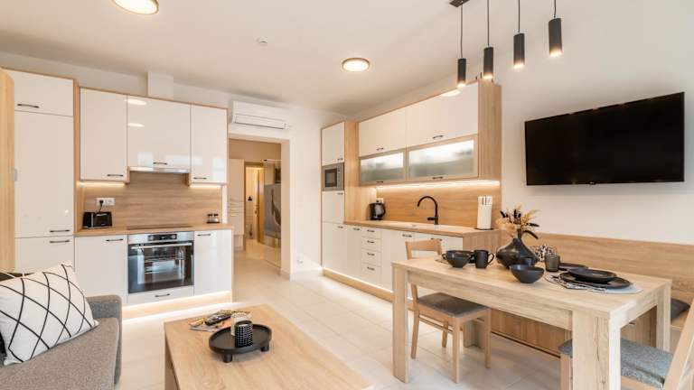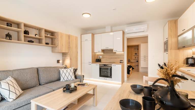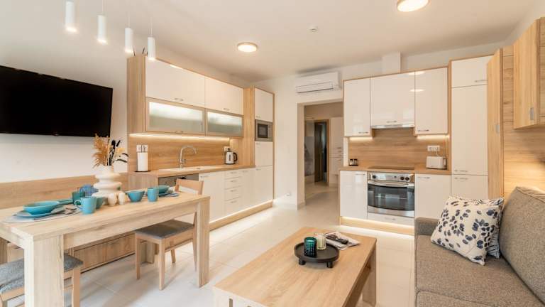Jede Wohneinheit verfügt über eine voll ausgestattete Küche mit einem Esstisch, Kühlschrank, Geschirrspüler, Ofen, Kaffeemaschine und Wasserkocher.