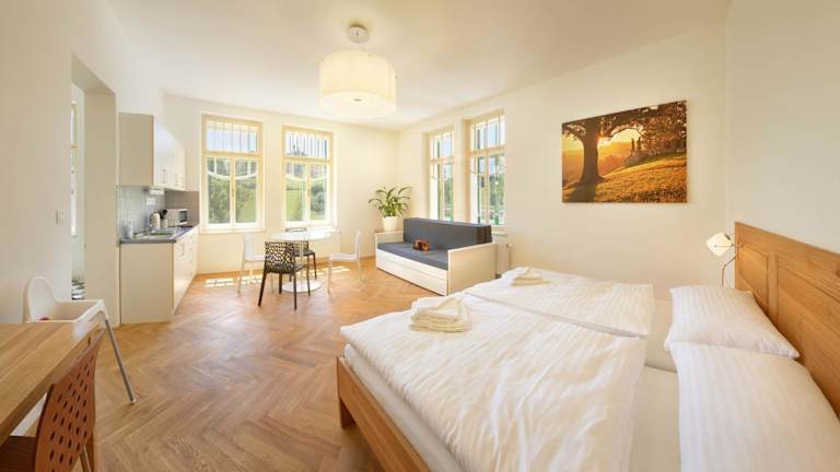 Das Jeschkeho vila a Lázeňský dům in Kuks bietet Ihnen einen angenehmen Aufenthalt mit Flussblick und kostenfreiem WLAN. Die Umgebung lädt zu Aktivitäten wie Wandern und Radfahren ein, während der Bahnhof Kudowa Zdrój und der Aqua Park Kudowa in der Nähe sind.
