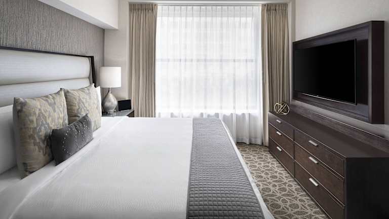 Die klimatisierten Zimmer sind ausgestattet mit einem Schreibtisch, einem Flachbild-TV und einem eigenen Bad mit Dusche und Badewanne. Zur weiteren Ausstattung gehören ein Safe, eine Minibar, ein Kühlschrank, eine Mikrowelle sowie eine Tee-/Kaffeemaschine. Die Zimmer bieten auch Hausschuhe und einen Gute-Nacht-Service. Rollstuhlgerechte Zimmer mit barrierefreiem Badezimmer sind ebenfalls verfügbar.