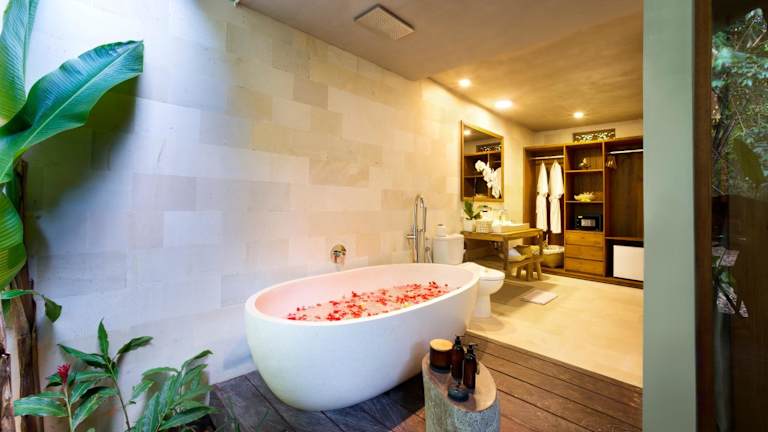 Das Kalapa Boutique Resort & Yoga ist ein idyllisches Refugium, nur wenige Minuten vom beliebten Surfspot Echo Beach entfernt. Das Resort besticht durch seine gelungene Kombination aus traditionellem javanesischem Dekor und luxuriöser Holzeinrichtung im Landhausstil. Hier können Sie inmitten von tropischem Grün entspannen, den Außenpool genießen, im Spa wohltuende Behandlungen erleben und köstliche Speisen im hoteleigenen Restaurant probieren. Kostenloses WLAN ist in der gesamten Unterkunft verfügbar. Das Resort bietet geräumige Zimmer und Villen mit herrlichem Ausblick auf den Fluss und den Dschungel. Die elegant eingerichteten Bungalows verfügen über einen Essbereich, einen Sitzbereich mit gemütlichen Sofas, einen Flachbild-Kabel-TV und einen eigenen Safe. Das Badezimmer ist mit einer Badewanne und kostenlosen Pflegeprodukten ausgestattet. Das Resort hilft Ihnen gerne bei der Organisation von Touren und der Anmietung eines Autos, um Bali zu erkunden. Im SVA Spa können Sie sich bei wohltuenden Wellnessbehandlungen und Massagen verwöhnen lassen. Das freundliche Personal an der rund um die Uhr besetzten Rezeption steht Ihnen gerne bei chemischer Reinigung, Wäsche- und Bügelservice zur Verfügung. Im hoteleigenen Restaurant Rasa können Sie internationale Gerichte genießen und an der Bar werden Ihnen erfrischende alkoholische Getränke serviert. Das Frühstück kann auch auf Ihrem Zimmer serviert werden und ein Zimmerservice steht Ihnen zur Verfügung. Das Kalapa Boutique Resort & Yoga liegt nur eine 20-minütige Fahrt vom Golfplatz Nirwana Bali entfernt. Der internationale Flughafen Denpasar, der Tempel Tanah Lot und die malerischen Reisfelder in Jatiluwih sind jeweils in einer Autostunde erreichbar. Täglich werden kostenlose Yoga-Kurse angeboten, um Körper und Geist in Einklang zu bringen.