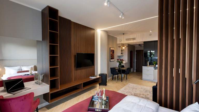 Die Zimmer sind klimatisiert und verfügen über eine voll ausgestattete Küchenzeile mit Essbereich, einem Flachbild-TV sowie einem eigenen Badezimmer mit Dusche, kostenlosen Pflegeprodukten und einem Haartrockner. Zur Ausstattung gehören Kühlschrank, Geschirrspüler, Mikrowelle, Kaffeemaschine und Wasserkocher.