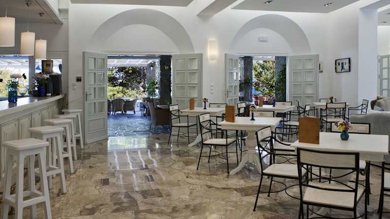 Das Kamari Hotel bietet ein Frühstücksbuffet, das im Preis inbegriffen ist. Es gibt auch eine Poolbar, eine Snackbar und ein Café.