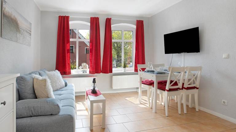 Die Ferienwohnung besteht aus einem Schlafzimmer, einem Wohnzimmer und einer voll ausgestatteten Küche mit Kühlschrank und Kaffeemaschine. Ein Badezimmer mit Dusche sowie ein Fernseher sind ebenfalls vorhanden.