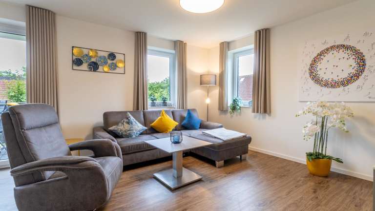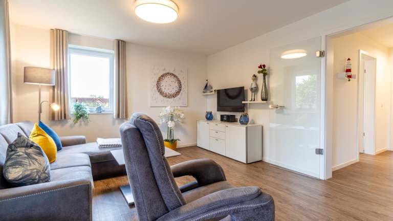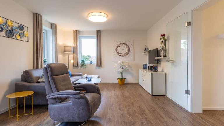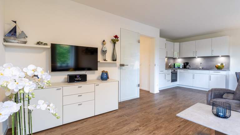 Die Ferienwohnung umfasst zwei Schlafzimmer, ein Wohnzimmer und eine voll ausgestattete Küche, die mit einem Kühlschrank und einer Kaffeemaschine ausgestattet ist. Zudem gibt es ein Badezimmer mit Dusche und Haartrockner. Ein TV ist ebenfalls vorhanden.