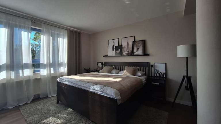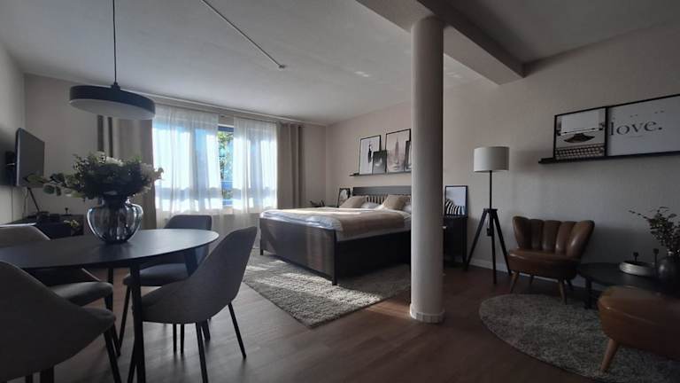 Die Ferienwohnung besteht aus einem Schlafzimmer und ist mit einer Küche ausgestattet, die einen Kühlschrank und einen Geschirrspüler umfasst. Zusätzlich gibt es einen Flachbild-TV, einen Sitzbereich sowie ein Badezimmer mit Dusche. Handtücher und Bettwäsche werden bereitgestellt.