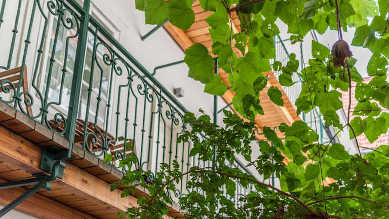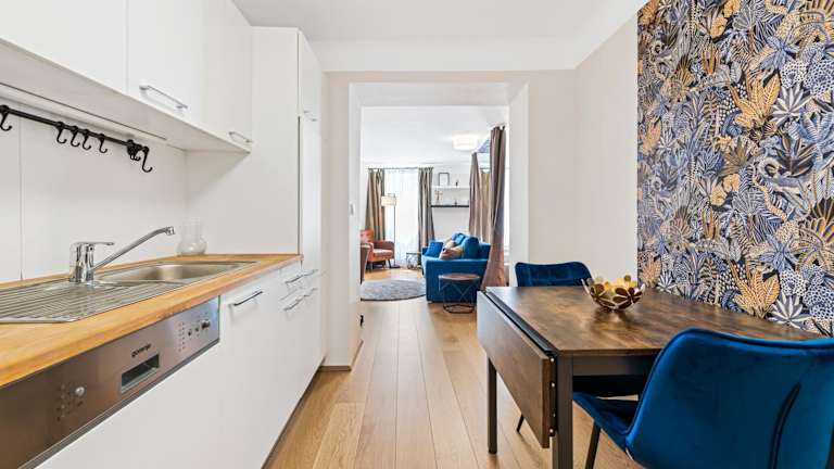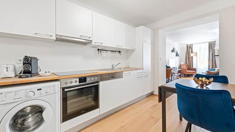 Die Wohneinheiten sind mit einer Küchenzeile ausgestattet, die einen Kühlschrank, Geschirrspüler und Herdplatte umfasst. In einigen Zimmern stehen Terrasse oder Balkon zur Verfügung.