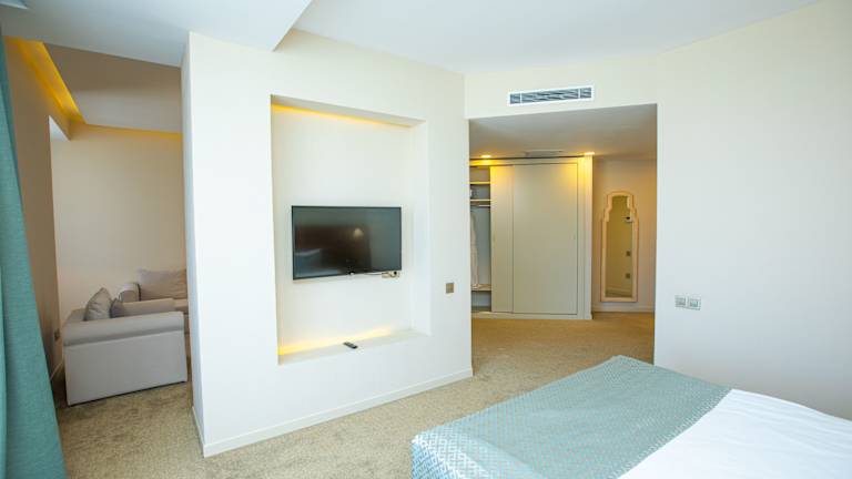 Die klimatisierten Zimmer sind mit einem Doppelbett oder einem Kingsize-Bett ausgestattet und bieten Meerblick. zur Ausstattung gehören ein Schreibtisch, Wasserkocher, Kühlschrank, Minibar, Safe, Flachbild-TV und ein eigenes Badezimmer mit Dusche. Die Zimmer sind zudem mit Heizung und kostenfreiem WLAN ausgestattet. Es werden verschiedene Zimmerkategorien wie Familien-, Nichtraucher- und Raucherzimmer angeboten.