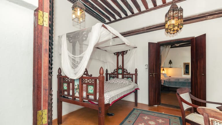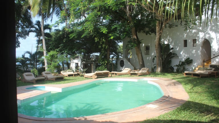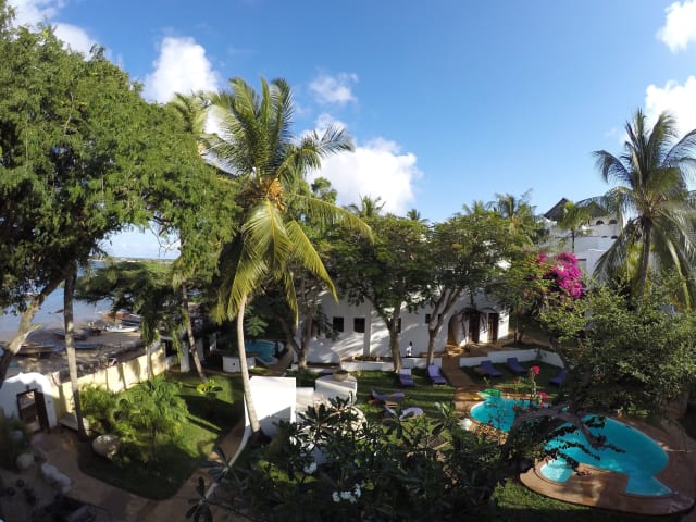 Das Kijani Hotel am Indischen Ozean wird von tropischen Gärten und einem Pool umgeben. Die Einrichtung umfasst natürliche, handgefertigte Möbel sowie Laternen und Ornamenten.