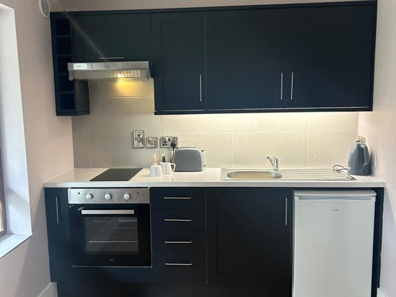 Die Ferienwohnung umfasst ein Schlafzimmer, eine Küche mit Kühlschrank und Ofen, ein Flachbild-TV, einen Sitzbereich und ein Badezimmer mit Dusche. Handtücher und Bettwäsche werden bereitgestellt.