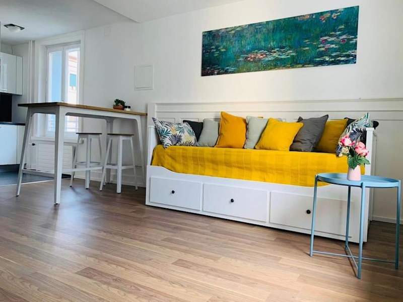 Die Ferienwohnung umfasst ein Schlafzimmer und eine vollständig ausgestattete Küche. Zur Ausstattung der Küche gehören ein Kühlschrank, ein Geschirrspüler sowie eine Kaffeemaschine. Handtücher und Bettwäsche werden zur Verfügung gestellt.