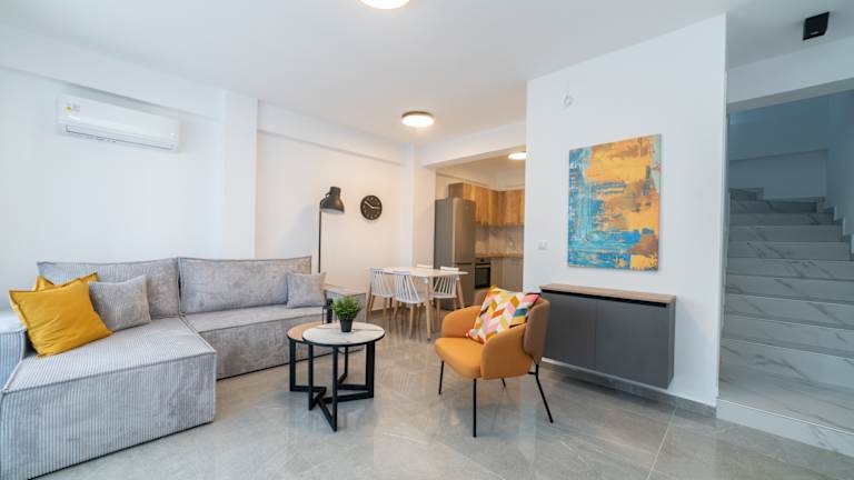 Diese voll ausgestattete Villa mit zwei Schlafzimmern bietet im Erdgeschoss ein Wohnzimmer, einen Essbereich, ein Badezimmer und eine Küche. Im ersten Stock befindet sich ein Schlafzimmer mit eigenem Bad und im zweiten Stock ein weiteres Schlafzimmer. Im Außenbereich können Sie den Garten genießen. Diese voll ausgestattete Maisonette-Wohnung mit drei Schlafzimmern bietet im Erdgeschoss ein separates Schlafzimmer, ein Wohnzimmer, ein Badezimmer und eine Küche. Im ersten Obergeschoss befindet sich ein weiteres separates Schlafzimmer mit eigenem Bad, und im zweiten Obergeschoss ein offenes Schlafzimmer. Dieses bietet Zugang zu einer geräumigen Terrasse mit Sonnenliegen. Im Außenbereich lädt der Garten zum Verweilen ein.