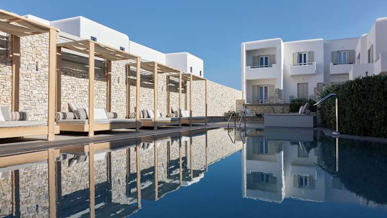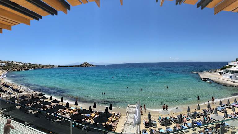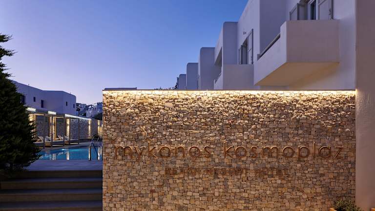 Das Kosmoplaz Beach Hotel befindet sich in ausgezeichneter Lage direkt am Strand von Platis Gialos, der mit der Blauen Flagge ausgezeichnet ist. Der Flughafen ist etwa 3 km entfernt und die Stadt Mykonos sowie der Hafen sind in ca. 4 km erreichbar. Der Sandstrand von Platis Gialos ist nur ca. 20 m vom Hotel entfernt und bietet Liegen und Sonnenschirme gegen Gebühr.