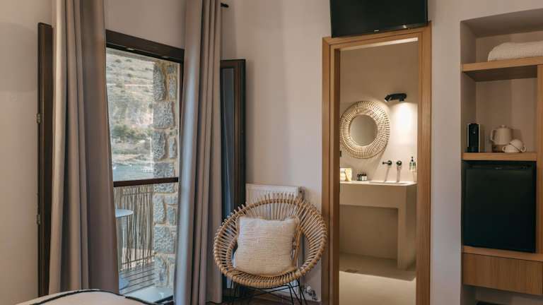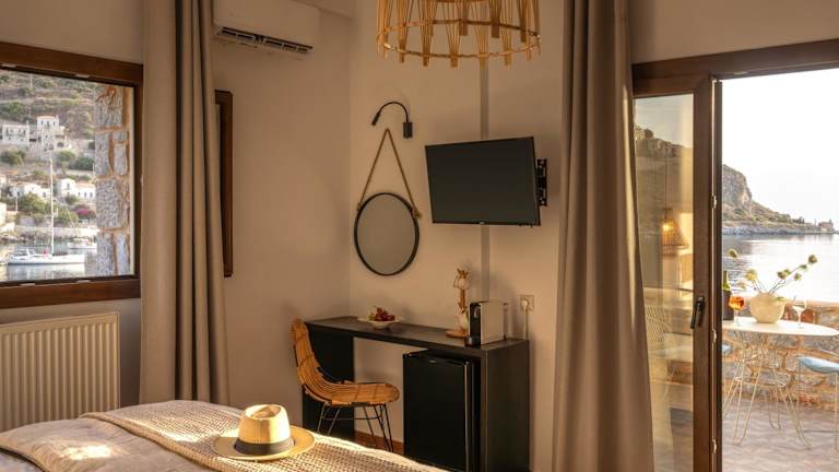 Die Zimmer der Kourmas Suites sind mit Klimaanlage, Kleiderschrank, Flachbild-TV, eigenem Badezimmer, Bettwäsche, Handtüchern und einem Balkon mit Meerblick ausgestattet. Jede Wohneinheit verfügt zudem über einen Kühlschrank.