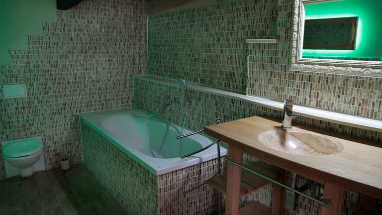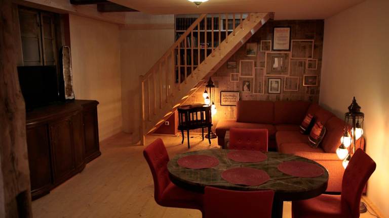 Das Hotel Kristallhaus anno 1438 besteht aus zwei Apartments mit separaten Eingängen, die jedoch durch eine Verbindungstür zu einem großen Apartment verbunden werden können. Die Zimmer sind mit Edelsteinen verziert und bieten eine einzigartige Atmosphäre. Jedes Apartment verfügt über einen Essbereich und eine voll ausgestattete Küche mit modernen Geräten wie Geschirrspüler, Ofen und Toaster. Ein Flachbild-TV und ein DVD-Player sorgen für Unterhaltung. In den Bädern finden Sie ebenfalls edelsteinverzierte Elemente. Handtücher werden gestellt.
