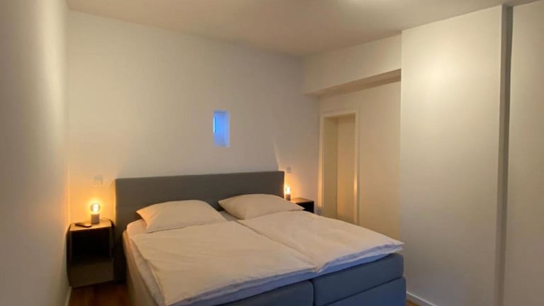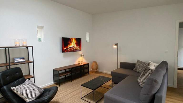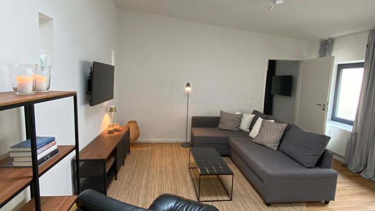 Die Ferienwohnung verfügt über ein Schlafzimmer und einen Wohnbereich mit einem Flachbild-TV. Eine voll ausgestattete Küchenzeile ist vorhanden, die einen Kühlschrank und einen Geschirrspüler umfasst. Das Badezimmer ist mit einer Dusche ausgestattet.