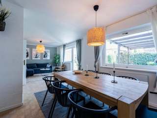 Das Ferienhaus verfügt über eine Terrasse, vier Schlafzimmer, ein Wohnzimmer sowie eine gut ausgestattete Küche, die unter anderem mit einem Kühlschrank ausgestattet ist. Handtücher und Bettwäsche werden bereitgestellt.