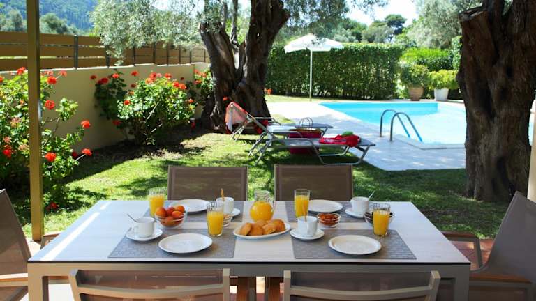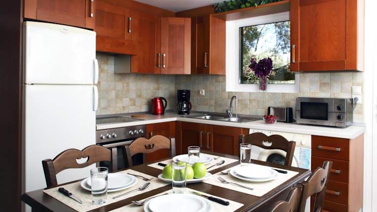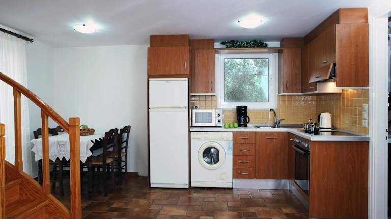 Die geräumigen Villen im Hotel Kydonies verfügen über eine voll ausgestattete Küche mit Essbereich, Herd und Kühlschrank. Ein gemütlicher Sitzbereich mit Sofas, Sat-TV und DVD-Player sorgt für angenehme Stunden in Ihrer Villa. Jede Villa bietet zudem einen eigenen Garten mit Sonnenliegen und einen atemberaubenden Blick auf die umliegende Landschaft und die Berge.
