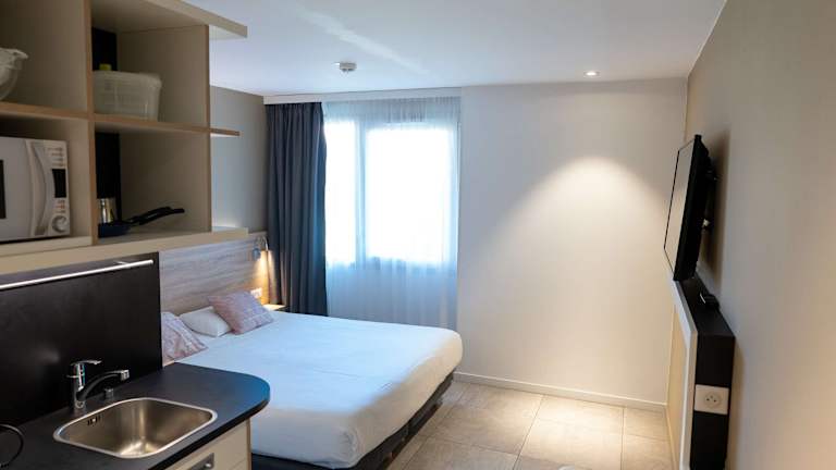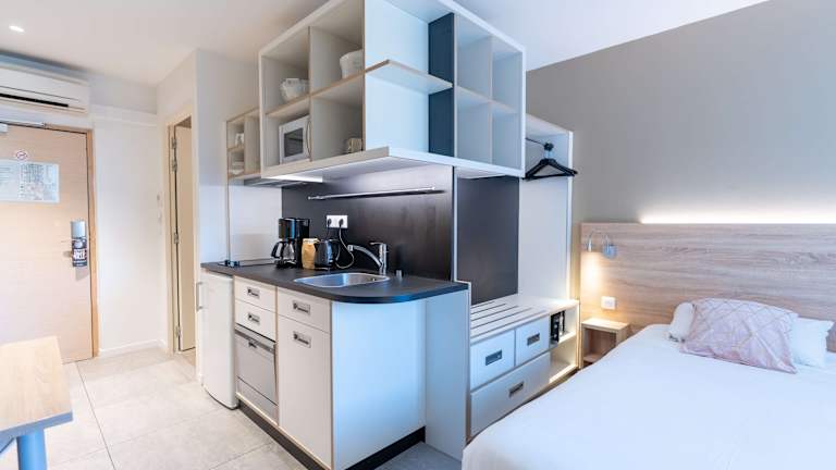 Die Zimmer im Kyriad Résidence Cabriès - Plan de Campagne sind komfortabel eingerichtet und verfügen über Annehmlichkeiten wie eine Klimaanlage, ein Doppelbett oder ein Schlafsofa, eine Mikrowelle, eine Kaffeemaschine und einen Fernseher. Die Badezimmer sind mit einer Dusche ausgestattet. Rollstuhlgerechte Zimmer sind ebenfalls verfügbar.