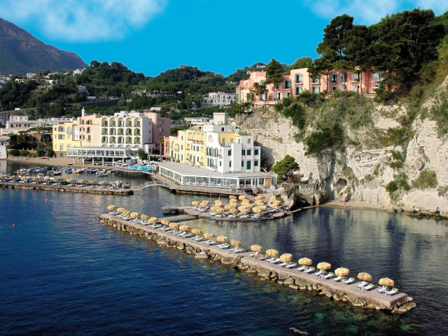 Das Regina Isabella-Resort Spa Restaurant ist ein luxuriöses Hotel, das direkt an den antiken griechisch-römischen Ruinen in Lacco Ameno auf der Insel Ischia liegt. Hier können die Gäste einen atemberaubenden Meerblick genießen und sich im Wellnesscenter oder einem der drei Pools entspannen. Das Hotel wurde in den 1950er Jahren gegründet und bietet einen einzigartigen mediterranen Stil in den Zimmern, die teilweise mit antiken Möbeln eingerichtet sind. Das preisgekrönte Restaurant Indaco serviert köstliche regionale Gerichte und internationale Küche. Das Hotel bietet außerdem Zugang zum Strand, ein Fitnesscenter und Privatparkplätze.