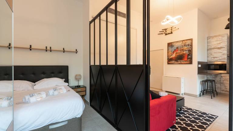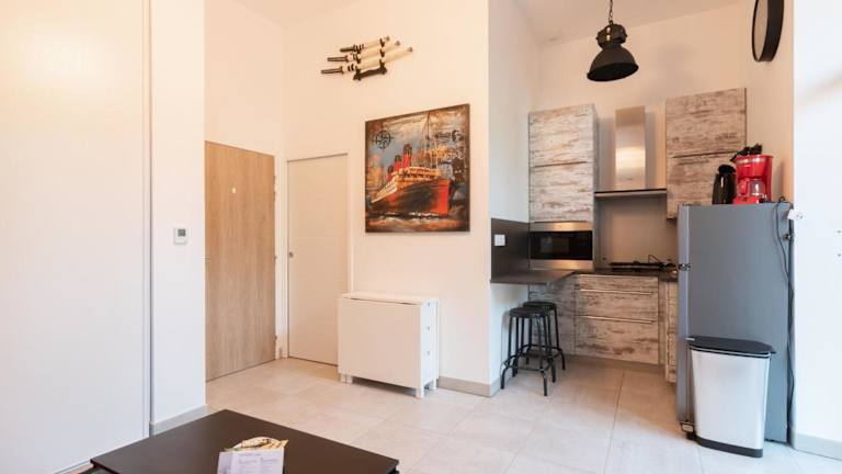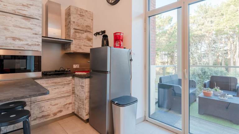Die Ferienwohnung umfasst ein Schlafzimmer, ein Wohnzimmer sowie eine voll ausgestattete Küche mit Kühlschrank und Kaffeemaschine. Ein Badezimmer mit Dusche ist ebenfalls vorhanden. Handtücher und Bettwäsche werden bereitgestellt.