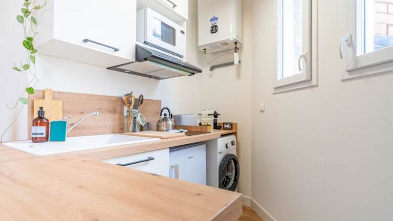 Die Ferienwohnung verfügt über ein Schlafzimmer und ein Wohnzimmer. Eine voll ausgestattete Küche mit Kühlschrank und Wasserkocher ist vorhanden. Das Badezimmer ist mit einer Dusche und kostenlosen Pflegeprodukten ausgestattet. Handtücher und Bettwäsche werden zur Verfügung gestellt. Gäste können einen Balkon und eine Terrasse nutzen.