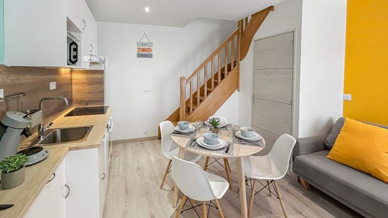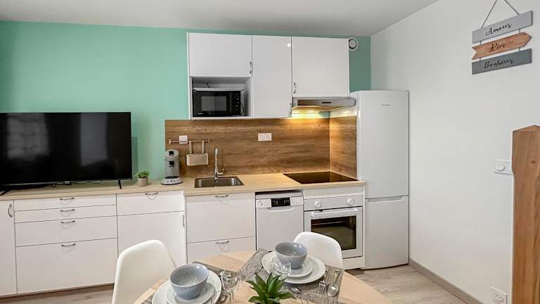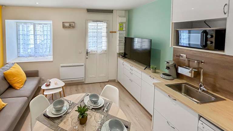 Die Ferienwohnung umfasst ein Schlafzimmer, ein Wohnzimmer sowie eine voll ausgestattete Küche, die mit einem Kühlschrank und einer Kaffeemaschine ausgestattet ist. Außerdem gibt es ein Badezimmer mit einer Dusche und einem Haartrockner. Handtücher und Bettwäsche sind ebenfalls vorhanden.
