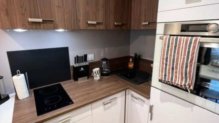Die Ferienwohnung verfügt über ein Schlafzimmer, eine Küche mit Kühlschrank und Ofen, ein Wohnzimmer mit TV sowie einen Sitzbereich. Ein Badezimmer mit Dusche ist ebenfalls vorhanden. Die Unterkunft bietet Nichtraucherzimmer und ist familienfreundlich.