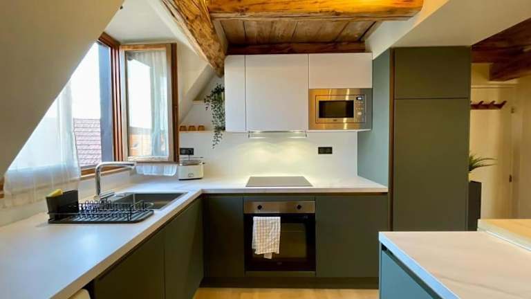 Die Ferienwohnung umfasst ein Schlafzimmer, ein Wohnzimmer sowie eine voll ausgestattete Küche mit Kühlschrank und Geschirrspüler. Handtücher und Bettwäsche werden bereitgestellt.