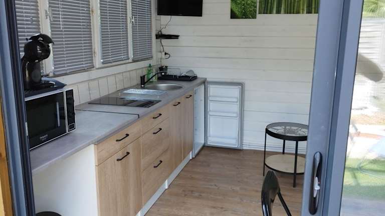 Das Ferienhaus im L escale jardin verfügt über ein gemütliches Schlafzimmer, eine gut ausgestattete Küche mit Kühlschrank und Mikrowelle sowie ein komfortables Badezimmer mit Dusche. Handtücher und Bettwäsche werden gestellt, um Ihren Aufenthalt so angenehm wie möglich zu gestalten.