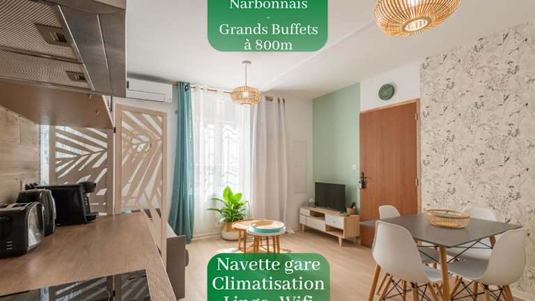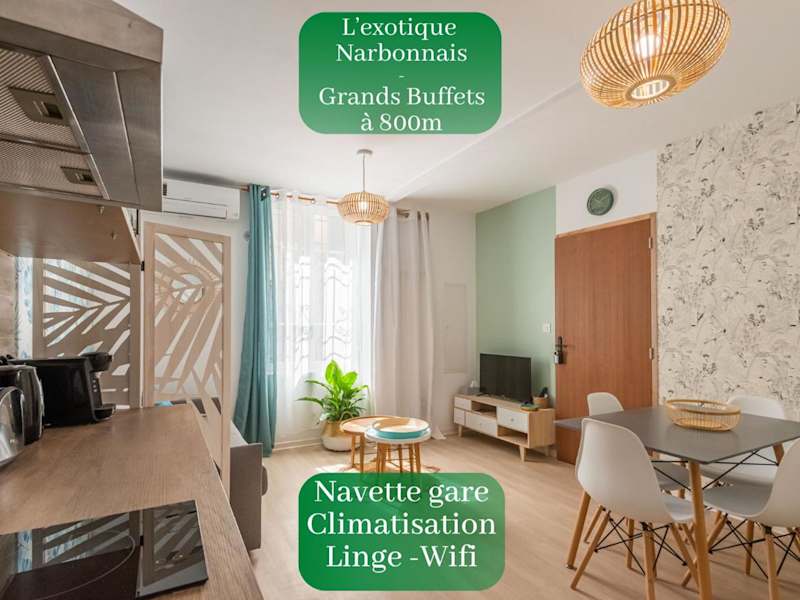 L'Exotique Narbonnais ist eine Ferienwohnung mit kostenlosem WLAN in der gesamten Unterkunft und Klimaanlage. Die Ausstattung umfasst ein Schlafzimmer, ein Wohnzimmer sowie eine voll ausgestattete Küche mit Kühlschrank und Kaffeemaschine. Die Unterkunft bietet ein Badezimmer mit Dusche und kostenlosen Pflegeprodukten.