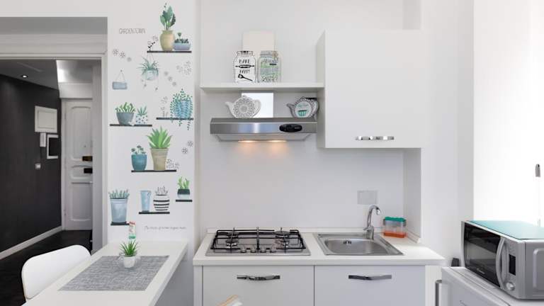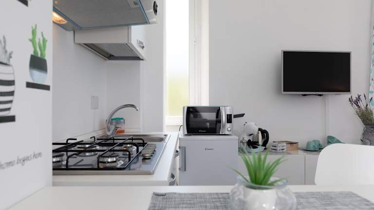 Die Ferienwohnung umfasst ein Schlafzimmer, ein Wohnzimmer und eine voll ausgestattete Küchenzeile. Die Küchenzeile ist mit einem Kühlschrank und einer Kaffeemaschine ausgestattet. Die Unterkunft verfügt zudem über ein Badezimmer mit Bidet und Dusche. Handtücher und Bettwäsche werden ebenfalls zur Verfügung gestellt.