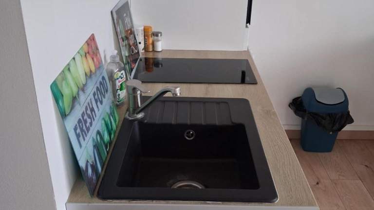 Die Unterkunft verfügt über eine voll ausgestattete Küche mit Kühlschrank und Kaffeemaschine zur Selbstversorgung. Weitere Verpflegungsoptionen sind nicht beschrieben.
