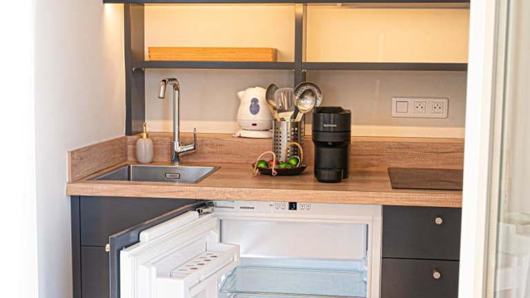 Die Ferienwohnung umfasst ein Schlafzimmer, ein Wohnzimmer sowie eine voll ausgestattete Küchenzeile mit Kühlschrank und Kaffeemaschine. Das Badezimmer ist mit einer Dusche und kostenlosen Pflegeprodukten ausgestattet. Handtücher und Bettwäsche sind ebenfalls vorhanden.