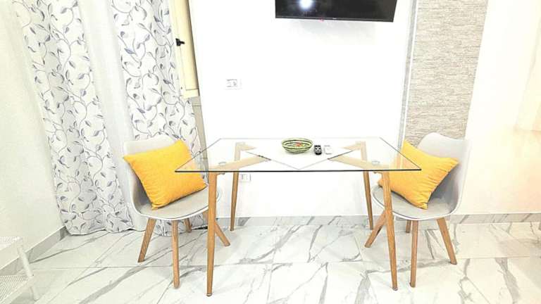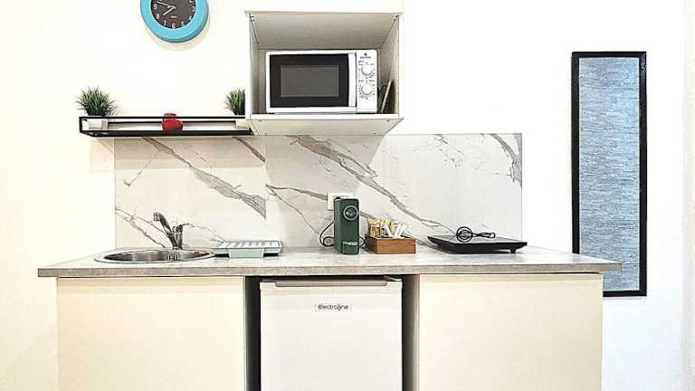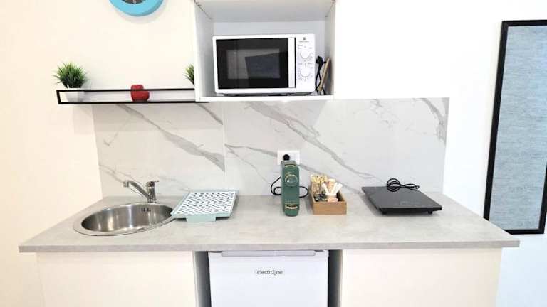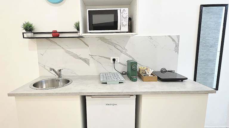 Die Unterkunft ist mit einer voll ausgestatteten Küchenzeile ausgestattet, die einen Kühlschrank, eine Mikrowelle, eine Herdplatte, eine Kaffeemaschine und einen Wasserkocher umfasst. Ein Essbereich ist ebenfalls vorhanden.