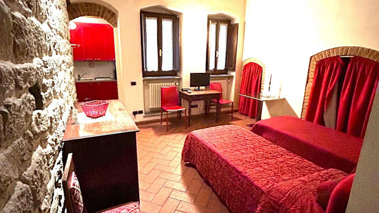 Die Zimmer im Hotel La Corte Del Re sind individuell gestaltet und verfügen über unverputzte Ziegelwände sowie bemalte oder Holzbalkendecken. Jedes Zimmer ist mit einer Klimaanlage, Sat-TV und einem eigenen Bad ausgestattet. Einige Zimmer bieten einen Blick auf die Piazza Grande. Die Zimmer verbinden antiken Charme mit modernem Komfort und bieten den Gästen eine gemütliche und einladende Atmosphäre.