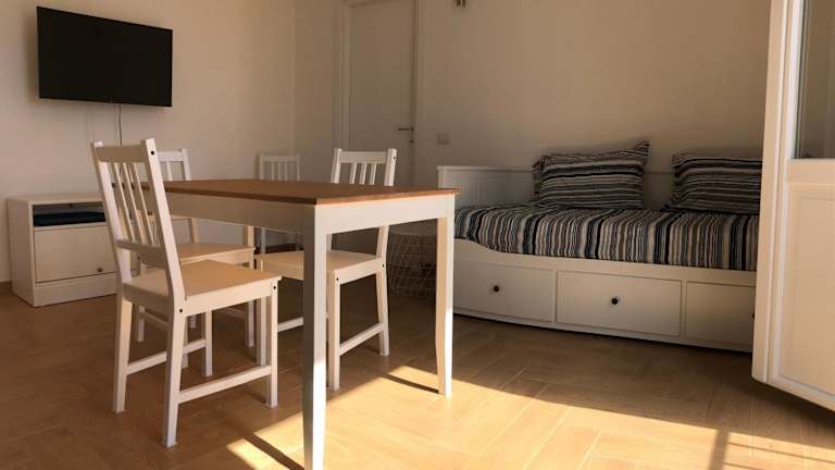 Die Ferienwohnung verfügt über ein Schlafzimmer, ein Wohnzimmer und eine voll ausgestattete Küchenzeile mit Kühlschrank und Wasserkocher. Das Badezimmer ist mit einem Bidet und einer Dusche ausgestattet. Handtücher und Bettwäsche können gegen Aufpreis zur Verfügung gestellt werden.