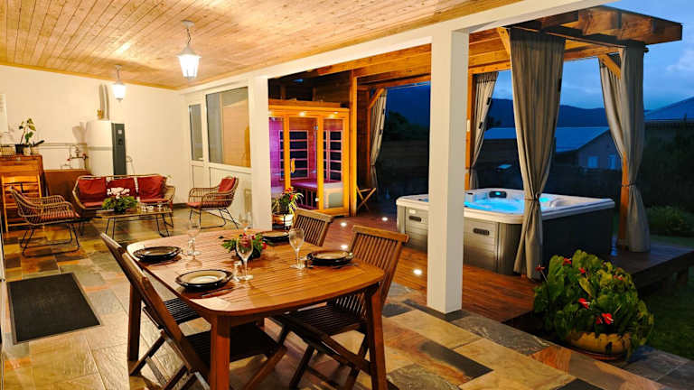 La kaz 57 - Maison avec SPA privatif ist ein Ferienhaus, das über eine Terrasse und eine Veranda/PATIO mit Aussicht auf die Berge verfügt. Es bietet einen kostenlosen Privatparkplatz und zeichnet sich durch einen Wellness-Bereich mit Sauna und Whirlpool aus.