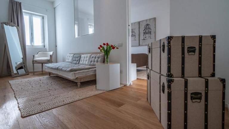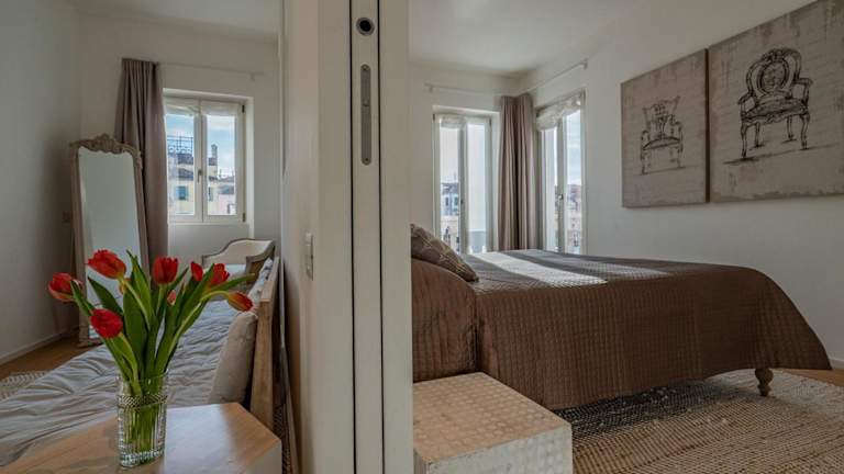 Die Ferienwohnung besteht aus zwei Schlafzimmern und einem Wohnzimmer. Die Küche ist vollständig ausgestattet mit Kühlschrank und Kaffeemaschine, während die zwei Badezimmer mit Bidet und Dusche ausgestattet sind. Handtücher und Bettwäsche werden bereitgestellt.