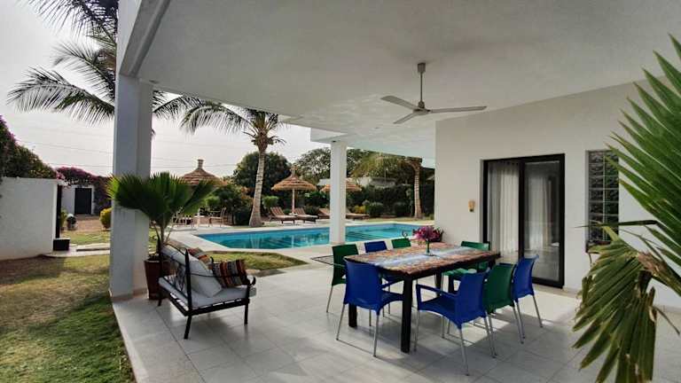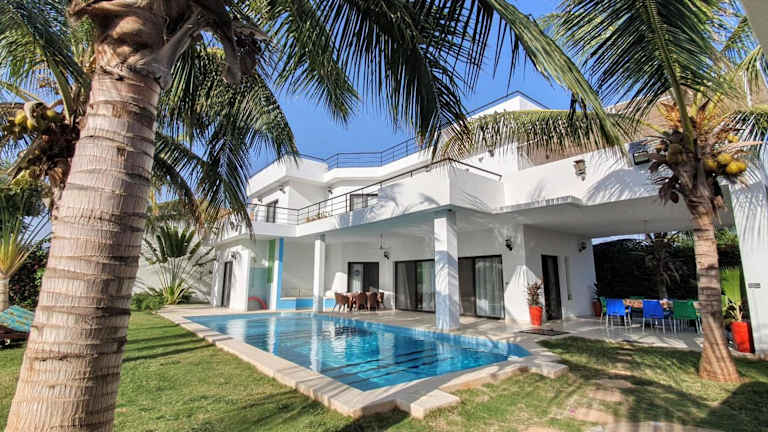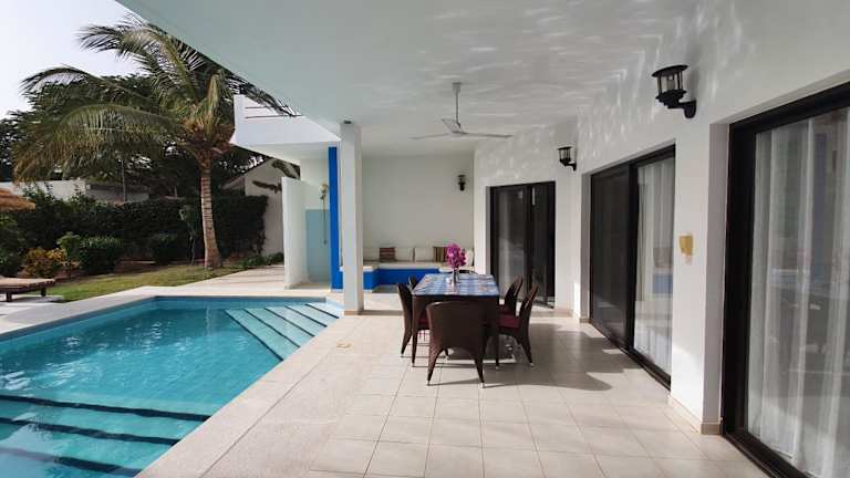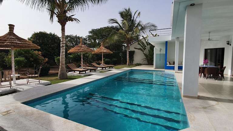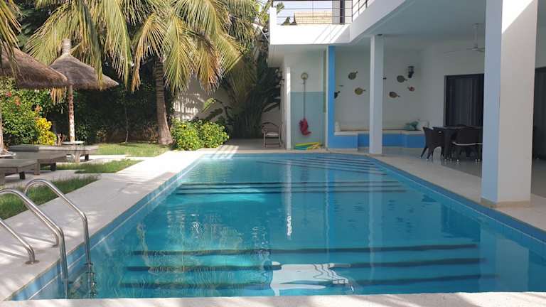 Verbringen Sie einen unvergesslichen Aufenthalt im La Maison Blanche à Ngaparou, einer herrlichen zeitgenössischen Villa. Genießen Sie den Außenpool, den Garten und die Terrasse mit kostenfreiem WLAN und einem atemberaubenden Blick auf die Stadt. Die klimatisierte Villa verfügt über 4 Schlafzimmer, ein geräumiges Wohnzimmer und eine voll ausgestattete Küche. Handtücher und Bettwäsche werden gestellt. Nutzen Sie auch den Grill und die kostenfreien Privatparkplätze. Der Strand Saly-Portudal ist nur 1,3 km entfernt und der Strand Ngaparou erreichen Sie nach 2,6 km. Der internationale Flughafen Blaise Diagne ist 27 km entfernt und ein kostenpflichtiger Flughafentransfer wird angeboten.