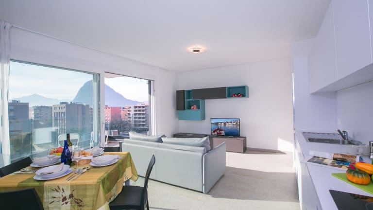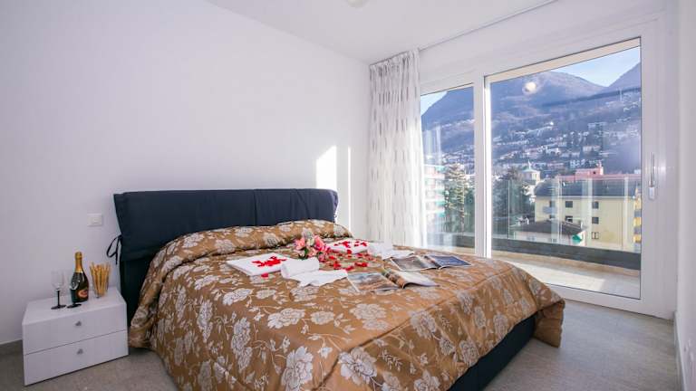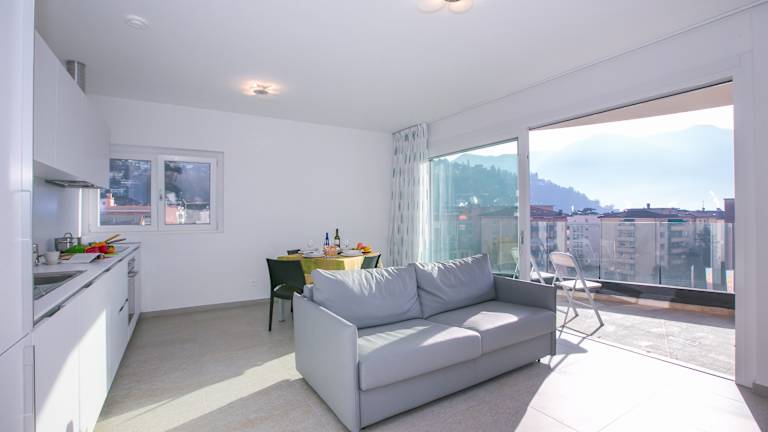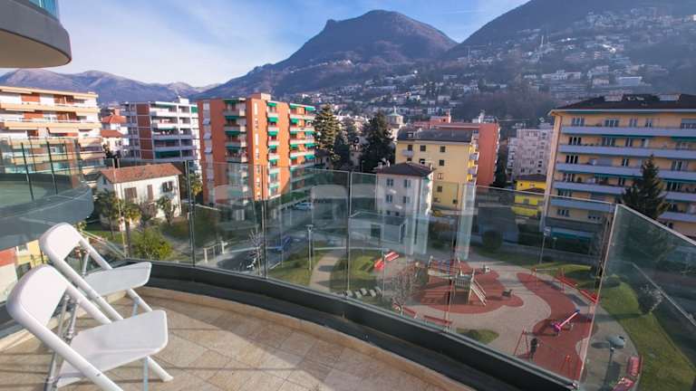Genießen Sie Ihren Stadt-Aufenthalt! Dieses Ferienapartment mit 1 Schlafzimmer befindet sich in fantastischer zentraler Lage in Lugano und ist das ganze Jahr hindurch eine schicke, erholsame Ausgangsbasis für Pärchen oder Gruppen mit bis zu 4 Personen. Das Apartment befindet sich im 5. Stock der Residenz und lässt sich praktisch mit einem Aufzug erreichen. Das geräumige Layout ist hell und modern gehalten und verfügt über Fußbodenheizung und mehreren Privatbalkonen mit Blick über die Stadt und auf die Berge. Das große Layout des offenen Wohnbereichs verleiht dem Ganzen einen Hauch Exklusivität und der zeitgemäße Stil lädt zum Entspannen und Verweilen ein. Vom Wohnbereich aus haben Sie Direktzugng zu einem Privatbalkon, was besonders in den sonnigen, warmen Monaten ein unverzichtbarer Bonus ist. Eine schicke, vollständig ausgestattete Küche mit Essbereich mit Platz für 4 Personen gibt Ihnen die Freiheit, auf Wunsch selbst etwas Köstliches zu kochen. Das stylishe, moderne Sofa und der Flachbild-Ferneher mit DVD-Spieler laden zu gemütlichen Abenden ein. Abgerundet wird das Apartment mit einem großen Schlafzimmer mit Doppelbett und Balkon und mit einem modernen Bad mit Dusche. Es eignet sich perfekt für ein Pärchen. Auf dem Sofabett im Wohnbereich können auf Wunsch zwei weitere Personen nächtigen. Somit eignet sich dieses Apartment für bis zu 4 Personen. Neben den sonnigen Balkonen mit Blick auf die Berge, können Sie natürlich auch die Gemeinschaftsanlagen der Residenz nutzen: ein Fitnessraum, ein Kinderspielplatz und private Parkmöglichkeiten. Die Residenz befindet sich in einem hübschen Wohngebiet und die Highlights der Stadt liegen nur einen Katzensprung entfernt. Die Schweizer Stadt Lugano ist das ganze Jahr hindurch ein perfektes Urlaubsziel. Hier finden Sie Restaurants mit verschiedenen Küchen, Designergeschäfte, kulturelle Museen, Kunstgalerien, Freizeitmöglichkeiten, ein aufregendes Nachtleben und viele Attraktionen für jeden Geschmack. Die Gegend ist nicht nur bezaubernd, sondern auch recht praktisch. Die Flughäfen in Lugano und Malpensa sind fix zu erreichen, die atemberaubenden Wanderrouten liegen nahebei, wie auch die Skigebiete und die Annehmlichkeiten des Comer Sees, Ticino und des Luganer Sees. Ein unvergesslicher Urlaub ist Ihnen gewiss! Entspannung Offener Wohnbereich • Der gut beleuchtete, offene Wohnbereich eignet sich das ganze Jahr hindurch zum Entspannen, zum Speisen, oder einfach, um kostbare Momente mit Ihren Lieben zu verbringen. • Mit stylishem Sitzbereich und schickem, modernem Sofa • Abgerundet mit Flachbild-Fernseher und DVD-Spieler • Große Glastüren führen hinaus auf die sonnige Balkonterrasse Kochen und Essen Offene Küche mit Essbereich • Perfekt für Pärchen oder Gruppen mit bis zu 4 Personen • Die Küche ist vollständig mit Ofen, Induktionsherdplatten, Mikrowelle, Toaster, elektrischem Wasserkessel, Kühl- und Gefrierschrank und Geschirrspülmaschine ausgestattet • Kochutensilien, Geschirr und Besteck sind vorhanden • Abgerundet mit einem schicken Essbereich mit Platz für bis zu 4 Personen Schlafen In diesem geräumigen Apartment können bis zu 4 Personen bequem schlafen. Es eignet sich für einzelne Personen, für ein Pärchen oder für eine kleine Gruppe. Hauptschlafzimmer • Ein großer Raum mit Privatbalkon • Mit modernem Doppelbett und einem praktischen Einbauschrank Extras • Ein zweites Pärchen (oder 2 zusätzliche Gäste) können wunderbar auf dem doppelten Sofabett im Wohnbereich nächtigen • Auf Wunsch können für einen kleinen Aufpreis ein Klappbett für Erwachsene oder Babybettchen gestellt werden Badezimmer Ein zeitgemäßes, gefliestes Badezimmer • Neu ausgestattet mit Massagedusche, Waschbecken und WC Zusätzliche Annehmlichkeiten Waschmaschine und Bügeleisen stehen Ihnen natürlich auch zur Verfügung. Gegen eine Zusatzgebühr kann ein WLAN-Modem gestellt werden. Das Apartment liegt im 5. Stock und ist leicht mit dem Aufzug zu erreichen. Damit Sie auch im Urlaub in Form bleiben, können Sie das kostenlose Fitnesszentrum der Residenz nutzen. Falls Sie mit größeren Gruppen verreisen, besteht die Möglichkeit, gemeinsam mit diesem Apartment auch weitere Apartments in der Perla del Ticino Residenz anzumieten. Es stehen noch ein ähnliches Studio und Apartments mit 1 Schlafzimmer und mit 2 Schlafzimmer zur Verfügung. Bitte anfragen. Außenbereich Zum Apartment gehören verschiedene sonnige Privatbalkone. Von hier aus haben Sie einen fantastischen Blick über die Residenz, über die Stadt und bis hin zu den Bergen im Hintergrund. Dieser Blick begeistert das ganze Jahr hindurch. Genießen Sie ihn morgens mit einer Tasse Kaffee und nehmen Sie abends Ihren Schlummertrunk auf dem Balkon ein. Zu dieser modernen Residenz gehört auch ein Kinderspielplatz im Freien, perfekt für die jüngeren Gäste. Parkmöglichkeiten Gäste können im Parkhaus parken. Ort Die Lage dieser Ferienwohnung ist einmalig. Die Sehenswürdigkeiten und Attraktionen in und um Lugano sind fix zu erreichen. Das moderne Zentrum am See bietet Boulevards mit Designerläden, Museen, Kunstgalerien, Kasinos und Nachtklubs sowie Antikläden, traditionelle Märkte und zeitlose Urlaubsaktivitäten. Zu den beliebten Attraktionen gehören der Parco Civico, das Museo Civico di Belle Arti, das Museo Cantonale d´Arte, das Museo Cantonale di Storia Naturale, das familienfreundliche Lido di Lugano, der Tennisplatz und die Cattedrale di San Lorenzo. Die charmanten, mit Cafés umsäumten Piazzen der Stadt, die idyllische Seepromenade, die Panoramablicke und die Bootsausflüge verleihen Ihrem Urlaub ein romantisch-italienisches Flair für einen unvergesslichen Aufenthalt in der relaxten und dynamischen Schweizer Seestadt. Die Verkehrsanbindungen in Lugano sind fantastisch: Fähre, Straßenanbindungen, Zugverbindungen und schnelle Erreichbarkeit des Flughafens. Das Apartment befindet sich nur 8 Autominuten vom Luganer Flughafen entf
